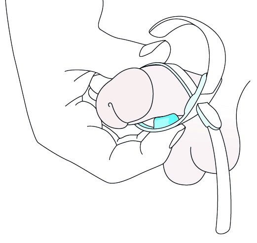 • Open de Prosecca® zodat u deze eenvoudig over de penis kan schuiven. Zorg dat het drukkussen aan de onderzijde in het midden van de schacht van de penis zit.